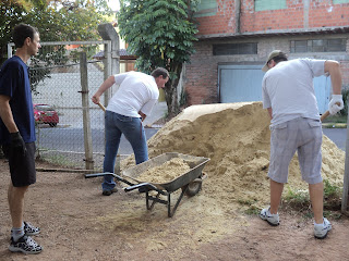 Areia da lagoa doada por um pai, sendo carregada para a caixa de areia |
